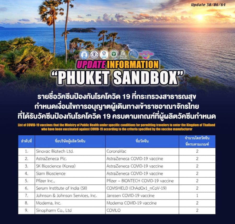 จากเดมกำหนดเรมสตารตเปดเมองรบนกทองเทยว แบบมเงอนไข ในวนท 1 ตลาคม ใหเลอนไปเปนวนท 1 พฤศจกายน 2564. วนท 25 กรกฎาคม 2564 - 1500 น. เปดเงอนไข ศบคทบทวน-ชะลอ ภเกตแซนดบอกซ.